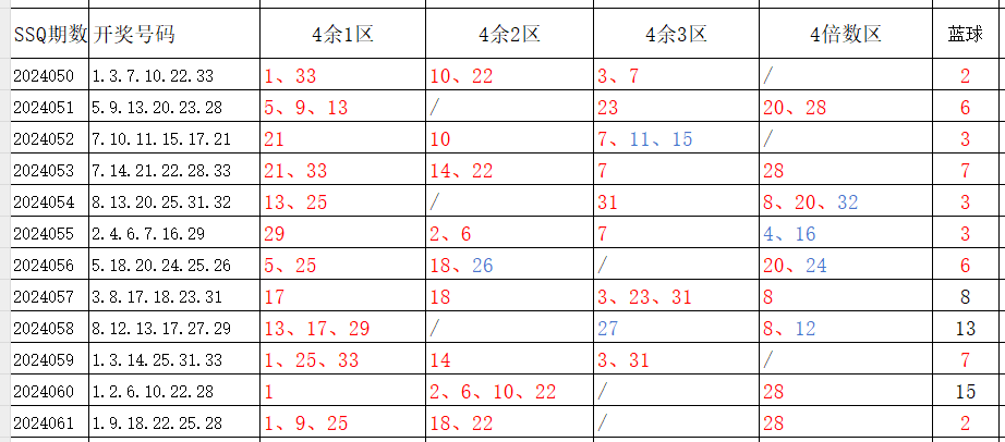 言归正传,分享第一个数据分析:四分区统计数据。相对于传统的三分区,个人习惯使用四分区统计数据,就是把33个红球号码除以4,所得 的余数分区如下: