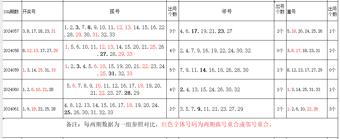 本期孤号:3.4.5.6.7.11.12.13.14.15.16.20.30.31.32.33;邻号:2.8.10.17.19.21.23.24.26.27.29;重点关注:24061-062期两期相同的孤号、邻号,可能在本期开出。个人分析,仅供参考。