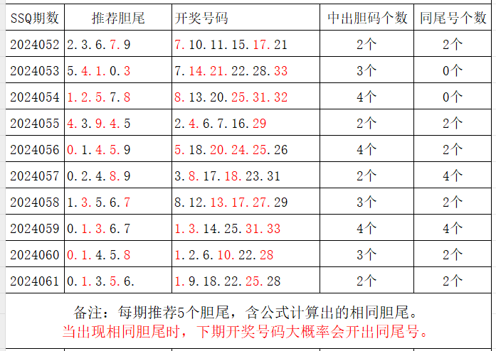 如图,每期推荐胆尾中出1-4个。特别注意:推荐胆尾是按照公式计算的顺序,不定位红球号码的顺序。当计算结果出现相同胆尾时,可能会开出同尾号。本期推荐胆尾:2尾/0尾/9尾/8尾/9尾。其中出现相同的胆尾9尾,可能会开出同尾号,但不是特指9尾的同尾号。个人分析,仅供参考。