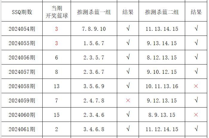 最后看蓝球号码的数据分析:相对于红球号码,蓝球才是一招致胜的关键。先看近一个周期内,重复开出的蓝球有:3.7,开出一次的蓝球有2.6.8.13.15,遗漏未出的蓝球有1.4.5.9.10.11.12.14。结合蓝球杀号,进一步精简蓝球号码。以近10期蓝球杀号的统计数据为例,每期推荐两组蓝球杀号,小数区、大数区各一组4码杀号。本期重点关注:蓝后区大数冷号可能开出,个人分析,仅供参考。