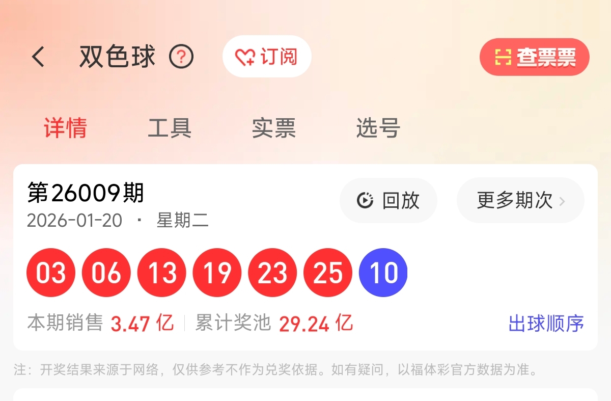 首先让我们回顾一下上期双色球26009期的开奖号码为 03、06、13、19、23、25,蓝球10。和值89,跨度22,区间比为2:2:2,奇偶比为5:1。