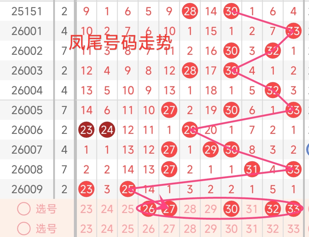 上期凤尾号码为25,振幅下降了8点,开出了奇数号码。回顾近期凤尾号码,振幅波动较大。上期凤尾为25。观察近期凤尾号码的走势,其数值波动范围在25 - 33之间。上期凤尾号码呈现出下降的趋势,预计本期凤尾号码会有所回补增大的趋势。预计本期凤尾号码可能会在26-33区间中产生。这个区间较符合近期凤尾号码增大的趋势,又处于历史上凤尾号码常出现的区间。本期还还需关注遗漏值较高的号码,有望在本期回补开出。本期凤尾号码可重点关注26、27、30、32、33。