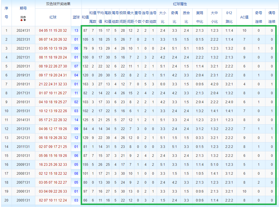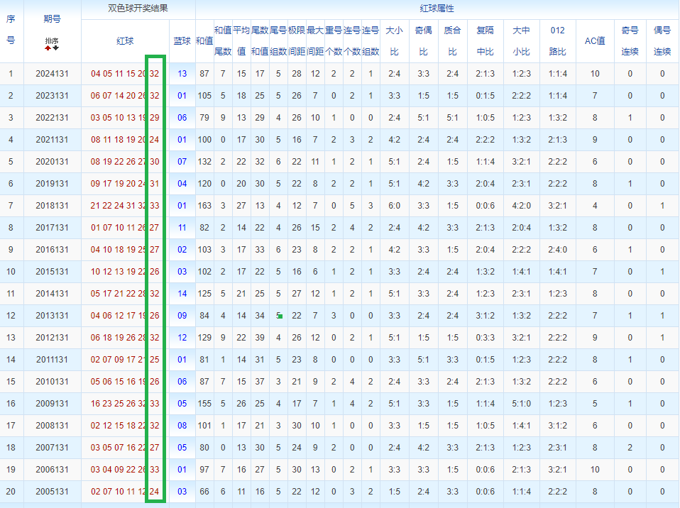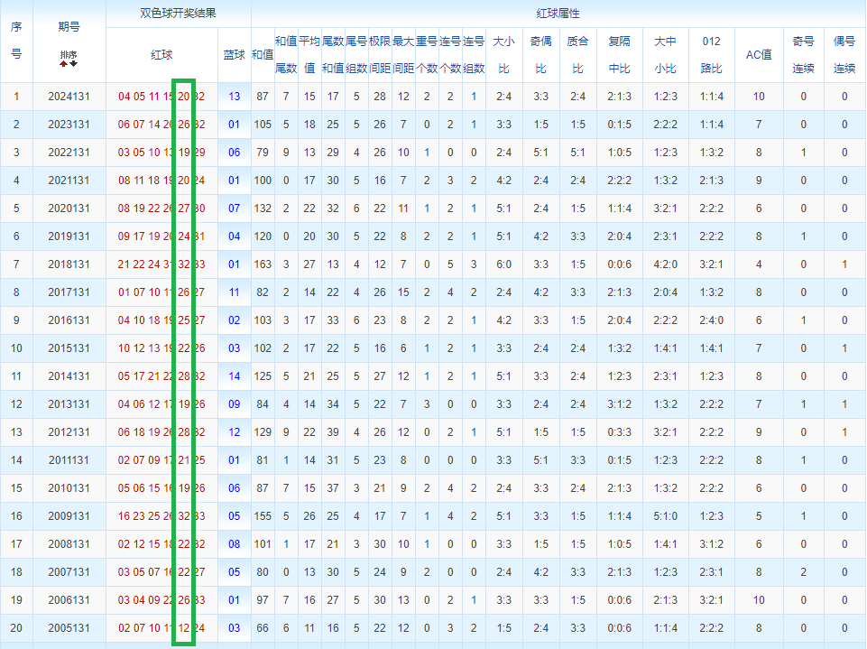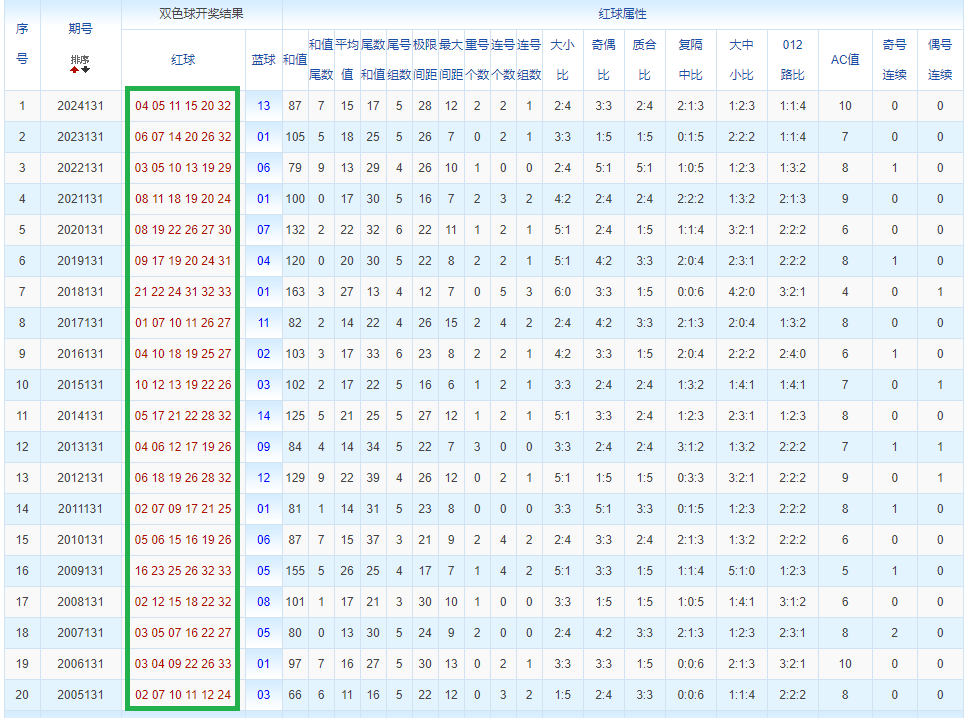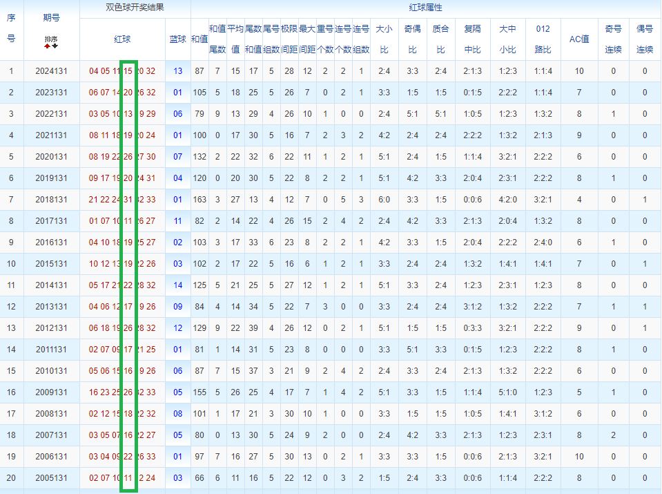通过观察,我发现双色球往年同期的开奖数据与本期号码之间存在显著关联。具体来说,在红球中,从第一位至第六位,通常会有约4个位置上的数字与往年同期相同位置的号码一致;而蓝球号码中,也有多期开奖结果直接包含了往年同期的数字。因此,我们可以借助往年同期各位置上的号码,作为分析本期开奖情况的重要依据。在此基础上,还可结合往年同期的其他相关条件,进行综合性的号码组合推荐。