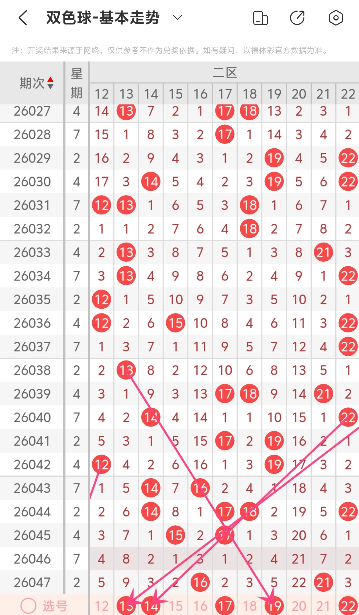 上期开出16、21,表现平稳。本期二区是连接一区回补和三区降温的关键。13、14为高频连号组合,近期活跃度极高;17、19为温号,22为热号(近5期出现3次),构成稳固的出号集群 。