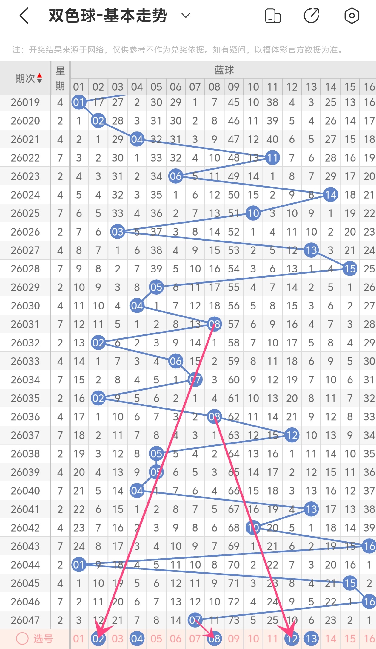 本期我们可以从上面走势图中看到选号的思路,推荐5码:02, 04, 06, 08, 12