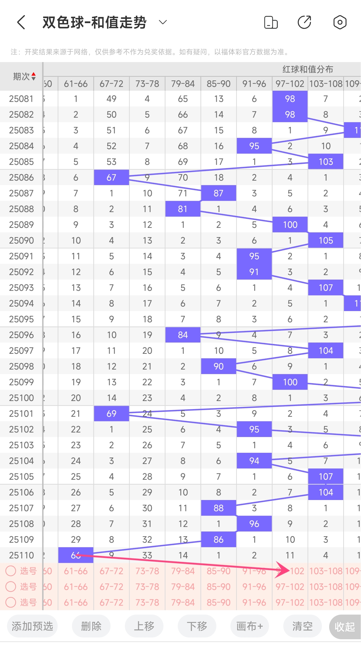 上期和值为66,而近5期和值为94,107,104,88,96,86,66均值83.2,上期和值较前一期减少了20,振幅为20。66和值是属于近30期内开出的最小的和值,下降的的空间已经非常小,上升的空间很大。所以推测本期和值趋势是大概率会往右上升,和值变大,小概率继续往左,和值变小。
