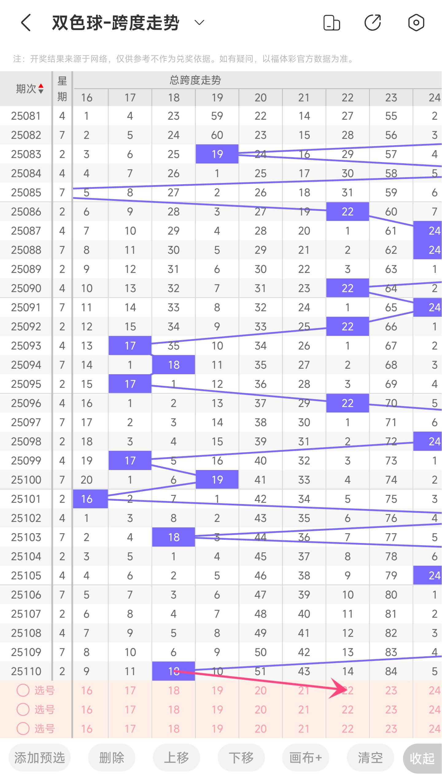 上期龙头为01,凤尾为19,跨度为18,往前一期跨度是26,偏移量为8。18跨度值是30期内开出的偏小的跨度值。上升的空间比较大,下降空间比较小,所以推测本期跨度有较大可能是跨度变大,趋势往右,小概率继续左,跨度变小。