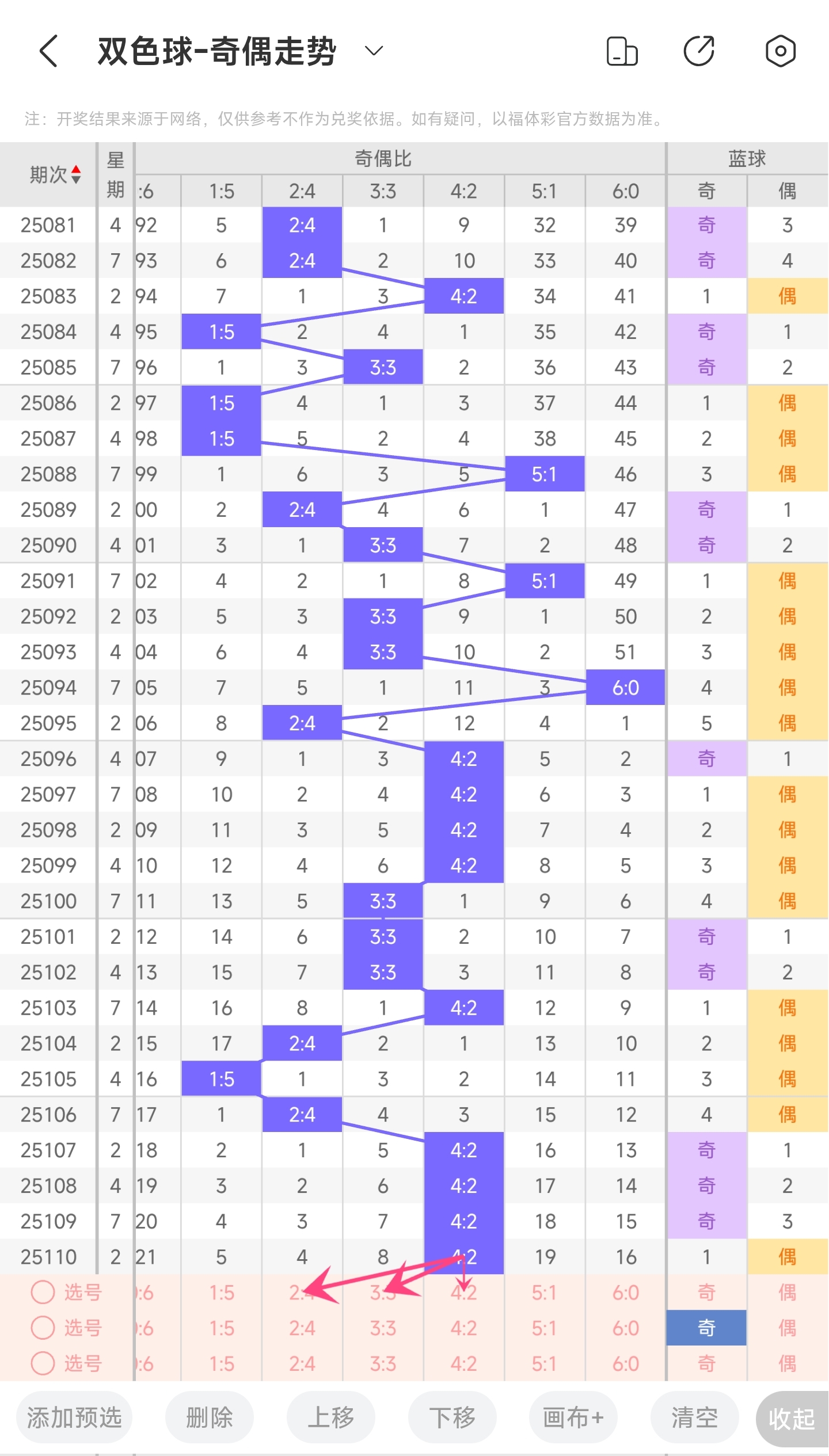 上期奇偶比为4:2,分别为奇奇奇偶偶奇。往前一期奇偶比为4:2。通过近30期内奇偶走势的数据分析,目前1:5奇偶比开出的概率是13.33%,5:1奇偶比开出的概率是6.66%,3:3奇偶比开出的概率是23.33%,4:2奇偶比开出的概率是33.33%,2:4奇偶比开出的概率是20%,6:0奇偶比开出的概率是3.33%。与前一期相比,4:2奇偶比概率变大了,3:3奇偶比概率变小了。通过分析走势图,4:2奇偶比已经连续开出4期了,本期较大概率不会再进行连出了。所以推测大概率可能会开3:3或者2:4奇偶比,小的概率可能会开1:5或者5:1奇偶比,更小的概率继续开4:2奇偶比。