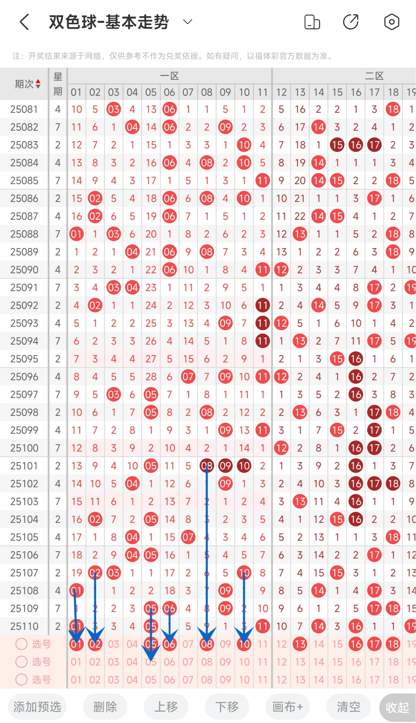 上一期开出01,05,11,往前一期开出05,06,09。通过走势图分析,我们可以看到一区最近几期开出的号码都比较多,且已经连续2期开出3个号码,所以本期有较大的可能性会减少号码。同时龙头走势可能继续开左边的号码,也可能又回到中间的位置。所以本期我们左边和中间的号码都要重点关注一下。然后结合遗漏期数和冷热号,本期我们可以关注01,02,05,06,08,10等号码。综上所述本期我们推测可能会开出01,02,05,06,08,10等号码。