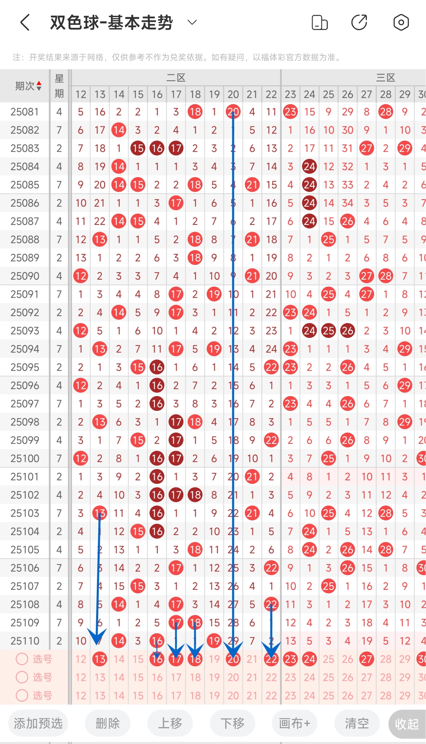 上一期二区开出了14,16,19等号码。往前一期开出了17,18。通过分析走势图,可以看到上期凤尾开在了二区,且二区开出了3个号码,所以本期有较大的可能性凤尾会回补到三区,且二区的号码应该会有所减少。二区中间号码依旧强势,所以本期也要重点留意中间的号码。最后结合冷热号和遗漏期数,本期我们可以关注一下13,16,17,18,20,22等号码。综上所述推测本期可能开13,16,17,18,20,22等号码。