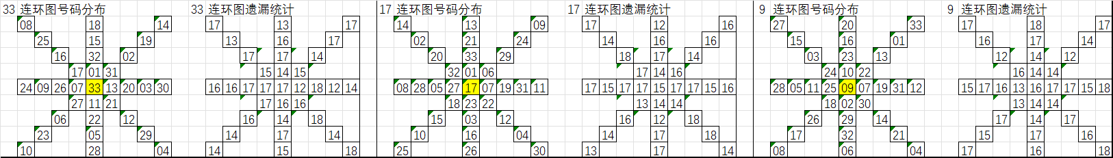由于数据量大,不一一统计,下图为各个号码分别在33、17、9连环图上的遗漏统计汇总图: