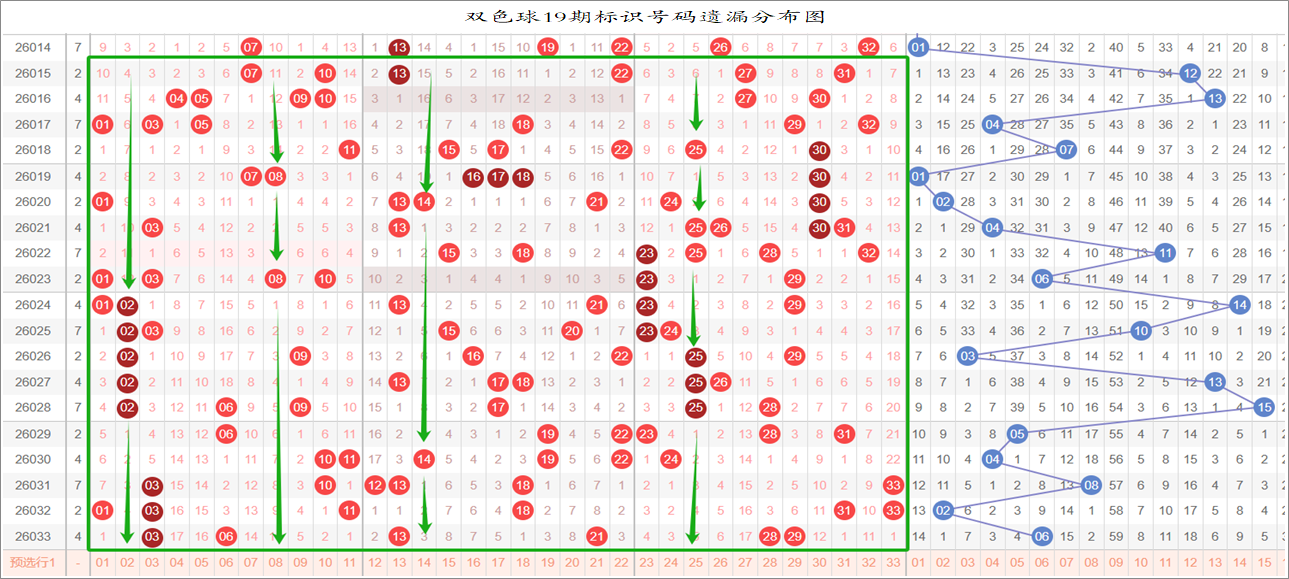 以上是33、17、9的连环图,可以在一起彩平台的九转连环图中查看历期号码分布,以当前期数来看,我们以19期号码来进行遗漏统计,然后把每个号码在近19期的遗漏总数统计出来,分别带入33、17、9的连环图,取出遗漏值大于16的号码,把这些号码在“环上”和“轴上”的相邻号码取出来进行统计,选取出次前15的号码作为大底。