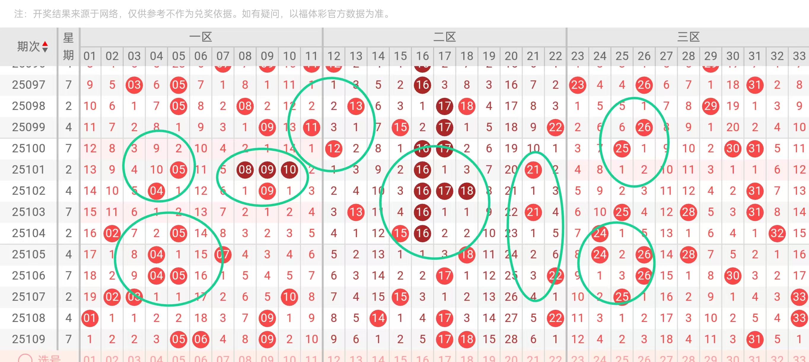 红球22在近31期中共出现5次,分布在2025082、2025086、2025090、2025094和2025098期。尽管出现次数尚可,但最近5期中未再出现,显示其热度正在下降。从号码分布来看,22号球常出现在第三、四区间(11-22、23-33),近期该区间号码整体偏冷,尤其是20-25区间号码出现频率较低。结合频率和区间冷热趋势,22号球短期内再次出现的概率较低。