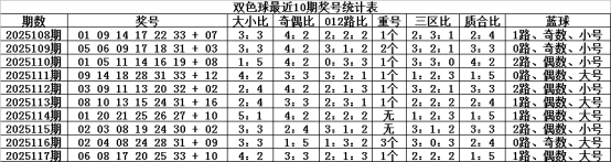 双色球第2025117期开出奖号为:06、08、17、20、25、33+10,其中红球号码奇偶比为3:3,大小比为4:2,012路比为2:1:3,和值为109,跨度为27,三区比为2:2:2,开出1个重复红球:08。蓝球开出偶数、大号、1路。