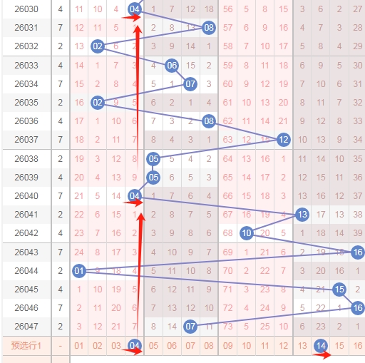 上图是福彩双色球蓝球开奖号码走势分布图,我标注出来的数字是蓝球4尾数数字04 14到本期为止蓝球4尾数数字已经连续遗漏了7期上次是连续遗漏了9期,那么本期或者近期大家还是记得留意一下蓝球4尾数的数字。