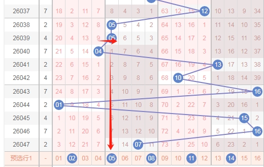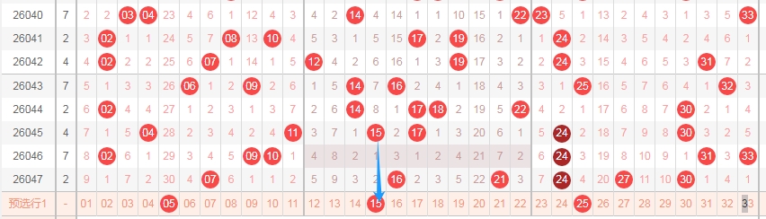 上图是福彩双色球红球开奖号码走势分布图,我标注出来的蓝色箭头表示红球号码5尾数的数字05 15 25到本期为止红球号码5尾数数字已经连续遗漏了2期,那么本期可以关注5尾数数字出一个或者两个。
