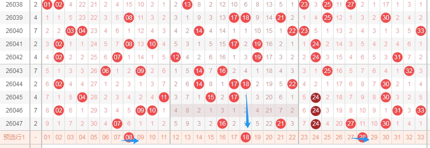 上图是福彩双色球红球开奖号码走势分布图,我标注出来的蓝色箭头表示红球号码8尾数的数字08 18 28到本期为止红球号码8尾数数字已经连续遗漏了3期,那么本期可以关注8尾数数字出一个或者两个。