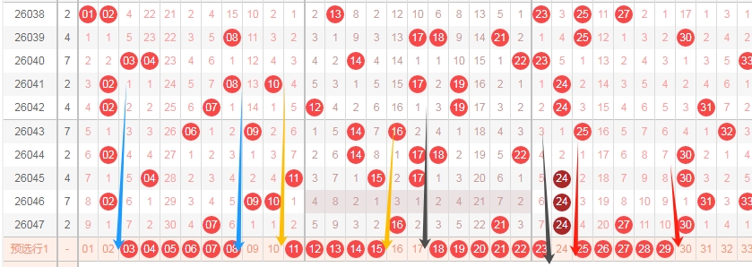 上图是福彩双色球红球开奖号码走势分布图,我标注出来的蓝色箭头中间的数字03 04 05 06 07 08一共是6个,最近4期只开出了两个数字,那么本期这个区域的数字可以关注出一个或者两个吧。我标注出来的黄色箭头中间的数字11 12 13 14 15一共是5个,最近两期一个数字都没出现,那么本期可以关注这个区域的数字出一个或者两个,我标注出来的黑色箭头中间的数字18 19 20 21 22 23一共是6个,最近3期只开出了一个数字,那么本期这个区域的数字可以关注出一个或者两个,我标注出来的红色箭头中间的数字25 26 27 28 29一共是5个,最近4期只开出了一个数字,那么本期可以关注这个区域的数字出一个或者两个吧。