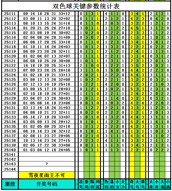 以下是作者手工统计的双色球关键参数统计表,对喜欢参数分析、过滤缩水、选号胆杀的技术性双色球爱好者有所帮助,其它读者可略过不看。