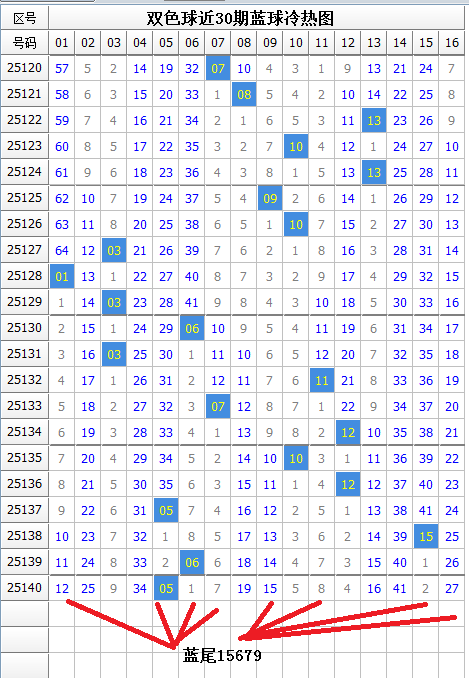 蓝球本期有热蓝8枚,冷蓝8枚,蓝球冷码数量一样。上期开出热蓝,这是连续两期开出,由于近期蓝球冷热交替开出规律不明显,本期蓝球冷热难定。
