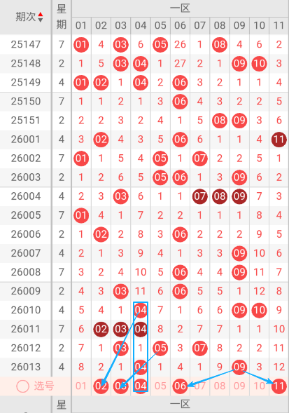 根据走势图可以看出当区段,004期开出03.07.08.09四个号码球 ,005期开出01一个号码球 ,006期开出02.06二个号码球 ,007期开出09一个号码球 ,008期开出06.09二个号码球 ,009期开出03.06二个号码球 ,010期开出04.09.10三个号码球 ,011期开出02.03.04三个号码球 ,012期开出03.05.07三个号码球 ,013期开出04.09个号码球 ,按照如此规律本期当前区判断可能会开出2双或1双1单。我们看下当前区上期没有开出重叠号,那么本期当前区要定重叠号的情况下可关注04号码球。再看下当前区段上期开出04斜连号,当期选号得留意03斜连号。建议重点关注02.03.04.06.11