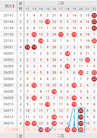 根据走势图可以看出当前区段,003期开出21一个号码球 ,004期开出18一个号码球 ,005期开出20.22二个号码球 ,006期开出22一个号码球 ,007期开出13.19二个号码球 ,008期开出16一个号码球 ,009期开出13.19二个号码球 ,010期开出15.19二个号码球 ,011期开出20一个号码球 ,012期开出16.20二个号码球 ,013期开出12.13.16.20四个号码球 ,按照如此规律本期当前区可能开出2双或1单1双。我们看下当前区上期开出16.20重叠号,那么本期当前区要定重叠号的情况下可关注20号码球。再看下当前区上期没有开出斜连号,当期选号得留意斜连19号码球。本区重点关注14.15.18.19.20
