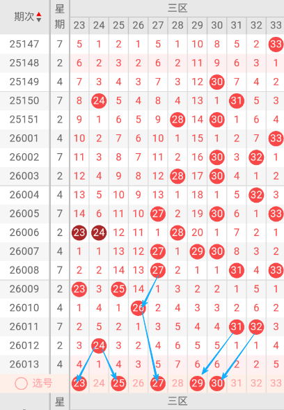 根据走势图可以看出当前区,004期开出32一个号码球 ,005期开出27.28.33三个号码球 ,006期开出23.24.28三个号码球 ,007期开出27.29.30三个号码球 ,008期开出27.31.33三个号码球 ,009期开出23.25二个号码球 ,010期开出26一个号码球 ,011期开出31.32二个号码球 ,012期开出24一个号码球 ,013期没有开出个号码球 ,按照如此规律判断本期当前区可能开出1单双。我们看下当前区上期没有开出重叠号,那么本期当前区要定重叠号的情况下可关注24码球。再看下当前区上期没有开出斜连号,当期选号得留意23斜连号。本区重点关注23.25.27.29.30