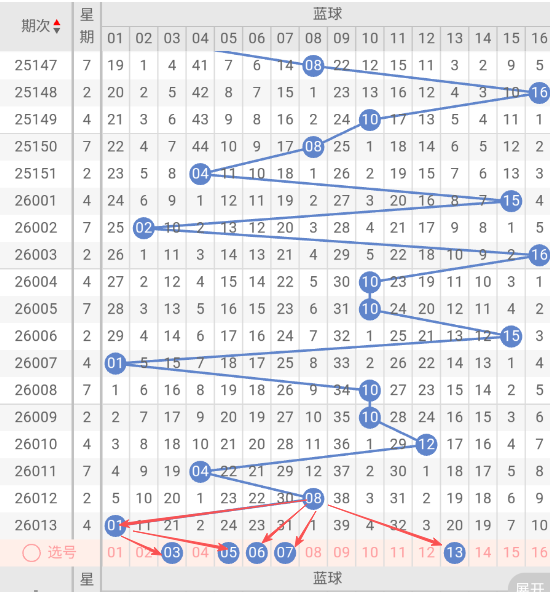 根据走势图近10期的走势看,蓝球在151期开出04蓝球之后,1大1小4大1小3大3小,再看下近10期的蓝球中冷码有回补的趋势,这种趋势规律本期判断极有可能开出单号,本期防蓝球10双号,蓝球本期重点关注03,05,06,07.13