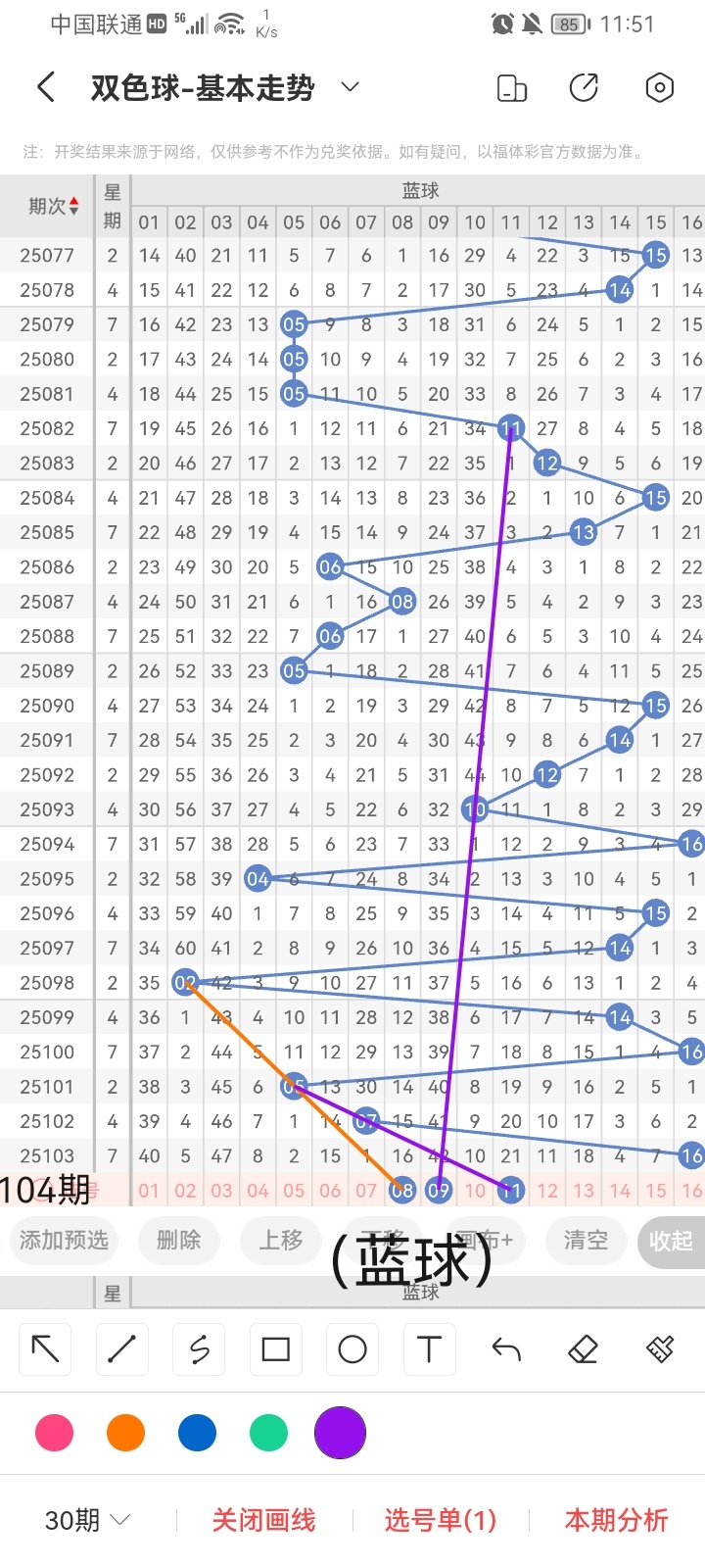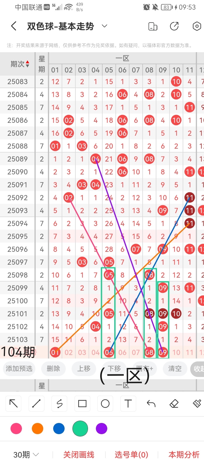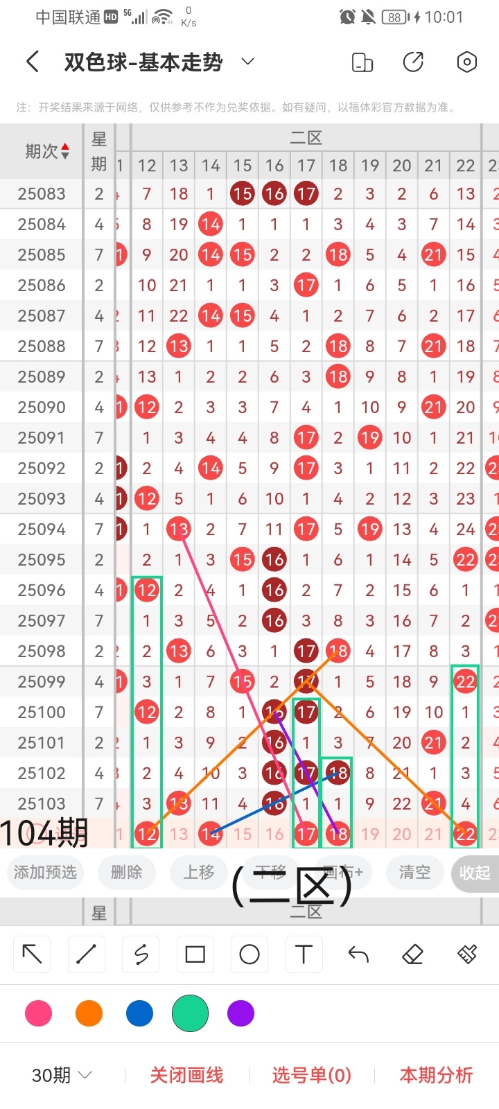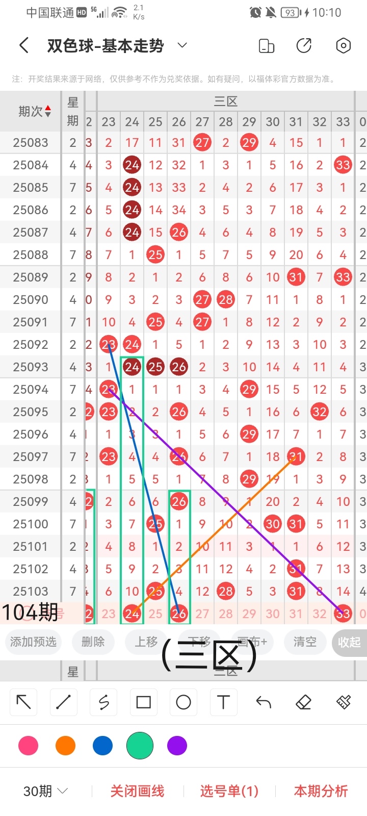 通过以上对上期的简单回顾,下面进入双色球第2025104期(下面简称本期)的选号分析: