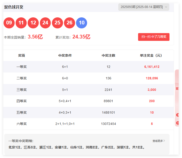 大家好,今天是2025年8月16日,那么双色球游戏呢,在明天8月17日星期日进行094期开奖,那么双色球上一期093期全国一等奖共开出12注,单注奖金616万。二等奖开出136注,单注奖金12.8万。