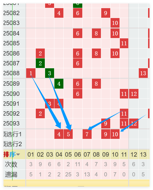 那么接下来对于094期红球进行分析,首先看一下一分区,我们看一下01~11上一期开了一个0911的组合,那么本期的话,我们要看一下小号走势。小号的走势主要的时候关注07。这么冷号,同时也是一个斜连号,那么07的如果是组合的话,大概是有040507,还有070910,所以说一分区大概也开不了这么多号码。可能会有一到两个