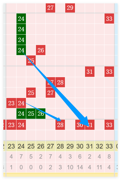 那么现在呢,我们再看一下红球大号区间,上一期开了一个三连24925.26,那么本期的话我们要防一下242526的一个变向,也就是22324,其次还要关注26往大号以及三字头进行旋转,那么三字头最远的时候能旋转到33,那么33很有可能和这个30进行一个组合