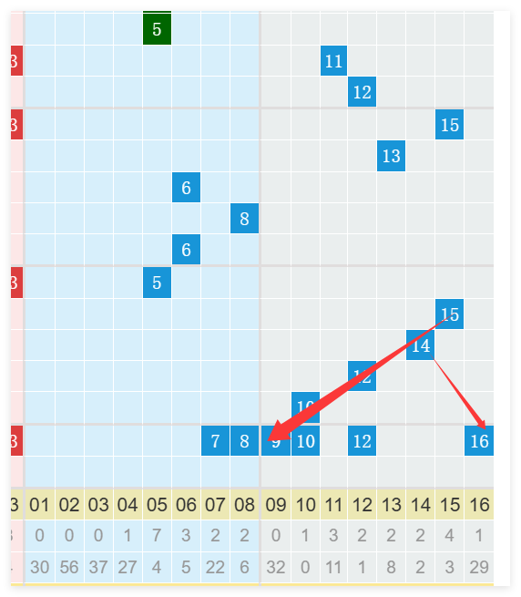 最后,我们看一下双色球蓝号上一期开了一个斜连10.12.14.本期蓝号难度依然很大,这个蓝号大概是回不到这个小号了。我们主要防一下这个贴边09,还有重号10号。这个贴边09呢,也是九十二十五的斜连这个重号也有可能蓝号走到这个位置进行重复直落。其次,我们要防一下往大号走的一个可能,但是这种可能可能性也是有的,但是可能性不是很大。往大号旋转,我们主要是看一下12号,以及冷号16