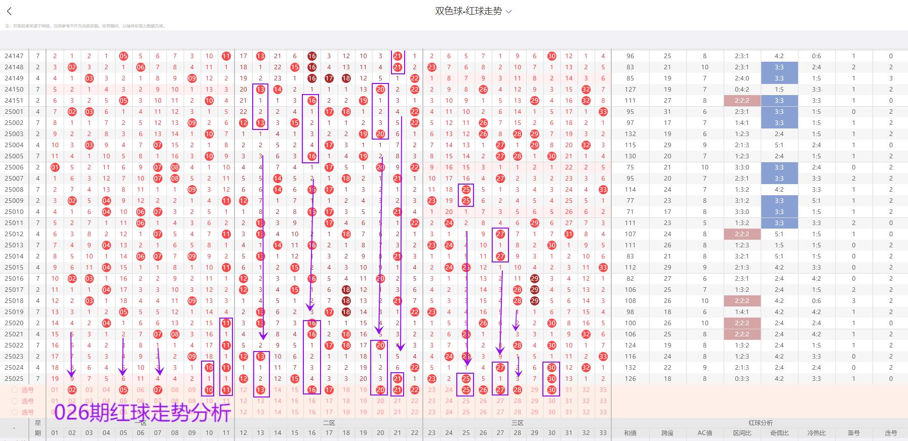 - 热号集群:第三区(25-33)占比达37%,其中25、30分别出现5次和4次,形成"高位热区"现象;质数号(如23、29)在近10期活跃度提升,与三区比0:3:3的偏态分布形成对冲。