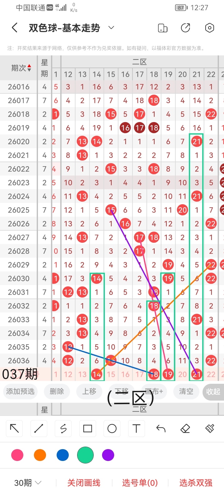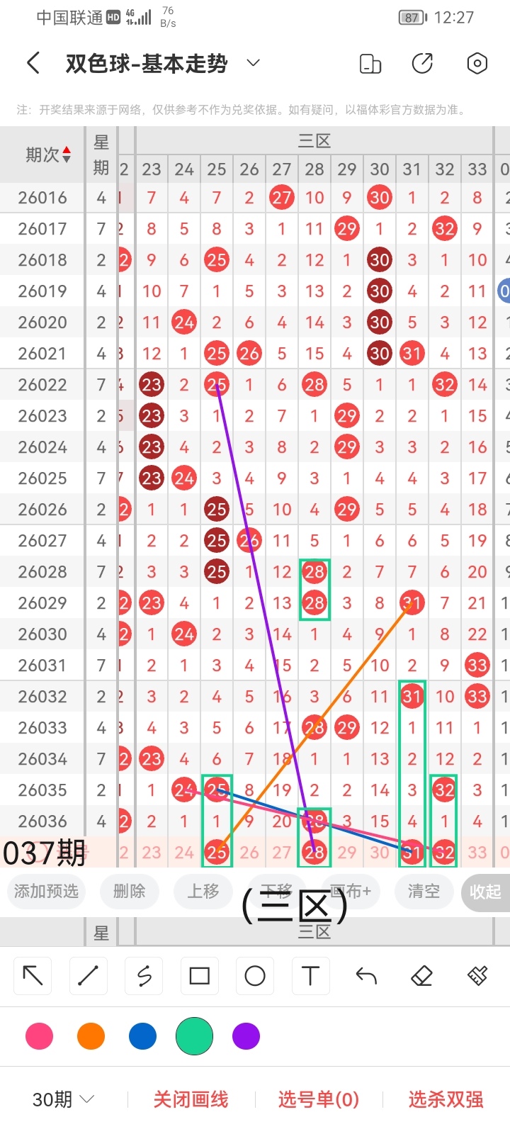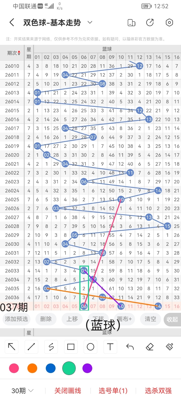 小梁结合上面图中画线思路分析得出,最后给大家汇总提供一下本期红球、蓝球数据,供大家参考: