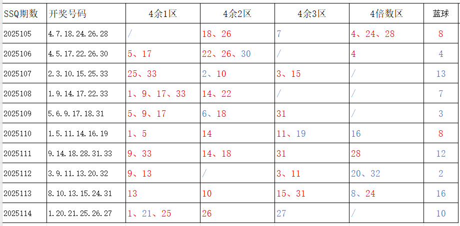 分享第一个数据分析:四分区统计数据。相对于传统的三分区,个人习惯使用四分区,就是把33个红球号码除以4,所得的余数分区如下: