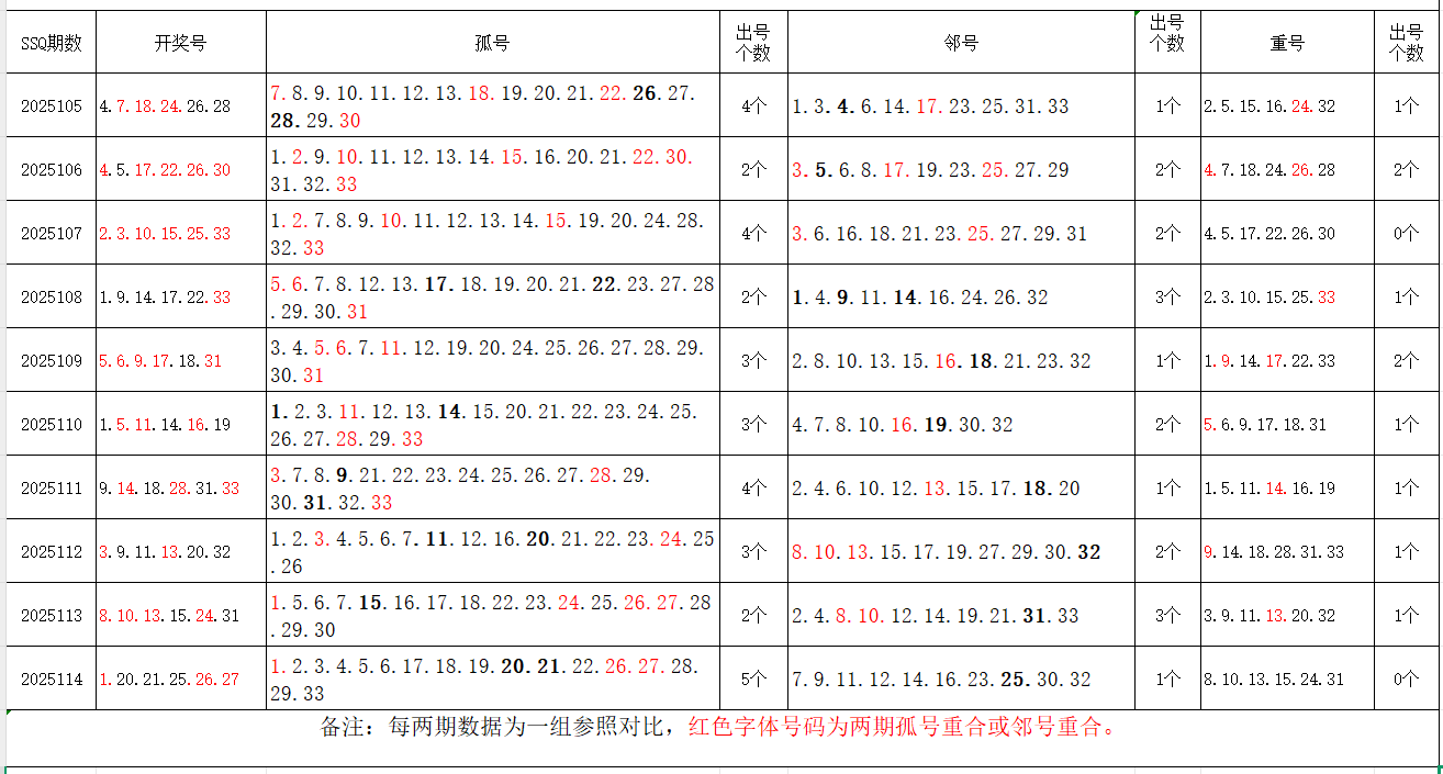 如图,以近两期数据为一组,进行对比分析。相同的孤号、邻号,可能在下期出1-4个左右。上期开出孤号5个,邻号1个,重号0个。本期参考孤号:3.4.5.6.7.8.9.10.11.12.13.14.15.16.17.18.23.29.30.31.32.33;邻号:2.19.22.24.28;孤、邻号重合号码精选:***(会员专区可见)。个人分析,仅供参考。