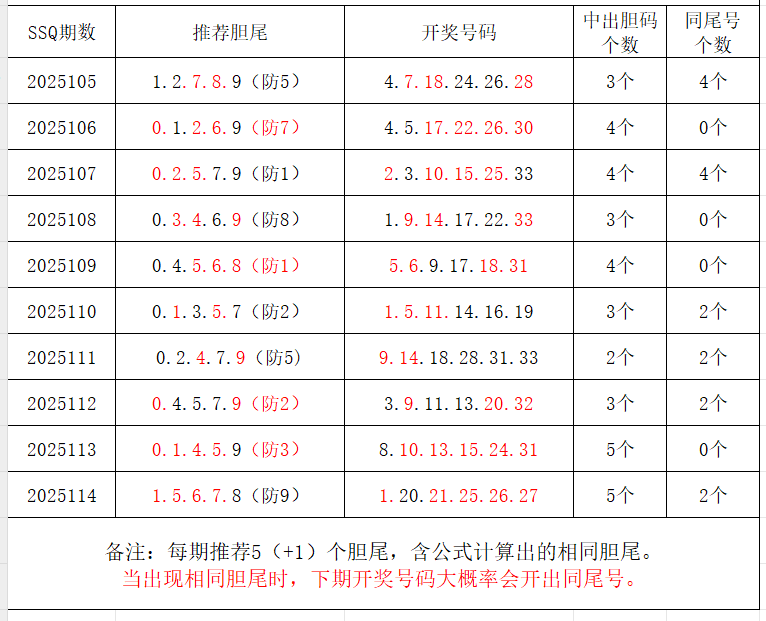 如图,每期推荐胆尾中出1-4个。上期推荐胆尾中出4尾5码!推荐胆尾是按照公式计算的顺序,不定位红球号码的顺序。本期推荐胆尾:1尾/7尾/9尾/0尾/3尾 。加推重点胆尾:***(会员专区可见)。推荐胆码号码:***(会员专区可见)。个人分析,仅供参考。