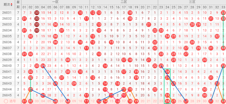 该区间呈现温和波动格局。出号量在1-2之间窄幅波动,这种稳定性是该区间最显著的特征。三区目前处于平稳输出阶段,本期可能会继续在23-33范围内开出1-2码。建议关注号码:24、25、27、31、33。