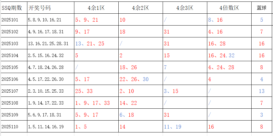 分享第一个数据分析:四分区统计数据。相对于传统的三分区,个人习惯使用四分区,就是把33个红球号码除以4,所得的余数分区如下: