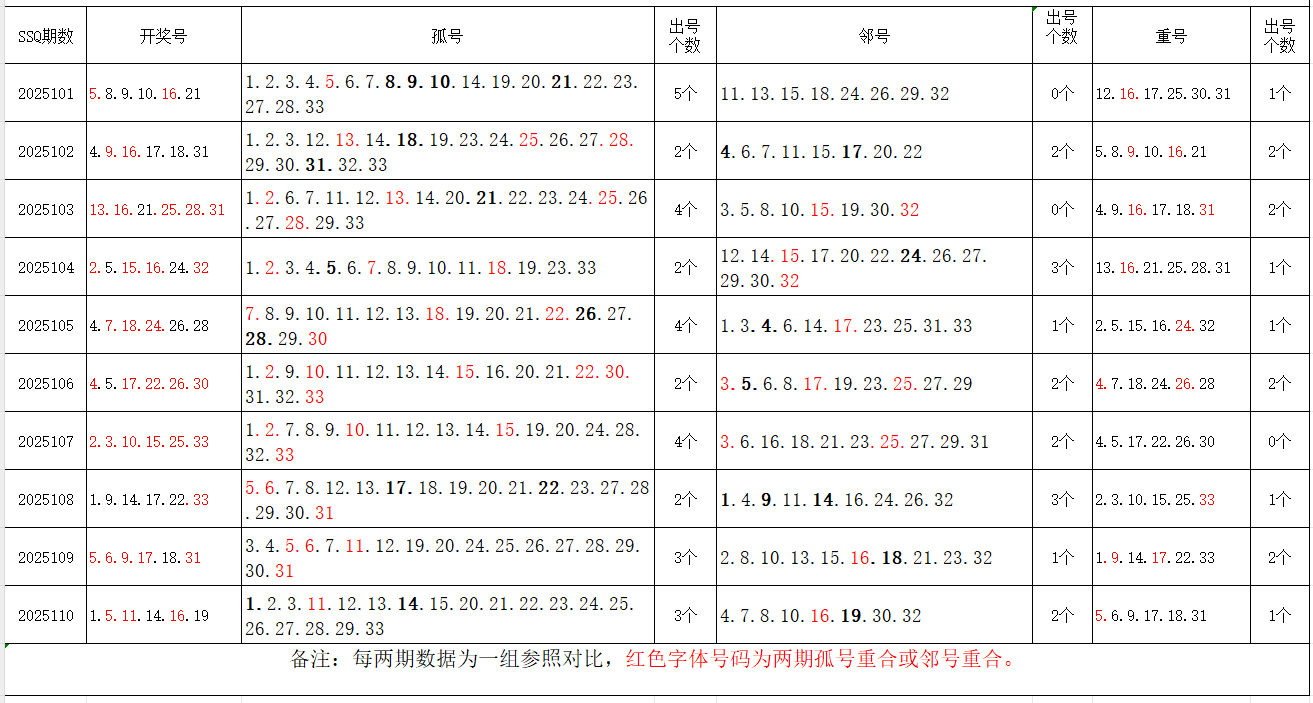 如图,以近两期数据为一组,进行对比分析。相同的孤号、邻号,可能在下期出1-4个左右。上期开出孤号3个,邻号2个,重号1个。本期参考孤号:3.7.8.9.21.22.23.24.25.26.27.28.29.30.31.32.33;邻号:2.4.6.10.12.13.15.17.18.20;孤、邻号重合号码精选:***(会员专区可见)。个人分析,仅供参考。