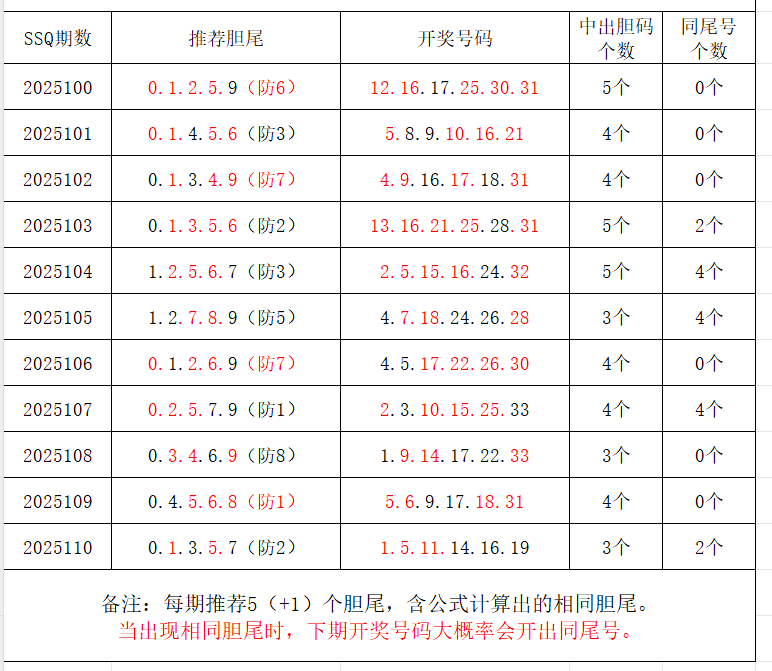 如图,每期推荐胆尾中出1-4个。上期推荐胆尾中出2尾3码!推荐胆尾是按照公式计算的顺序,不定位红球号码的顺序。本期推荐胆尾:9尾/4尾/0尾/7尾/尾 。加推重点胆尾:***(会员专区可见)。推荐胆码号码:***(会员专区可见)。个人分析,仅供参考。