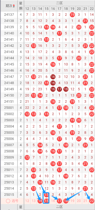 根据走势图可以看出当前区段,006期开出了17.20.22三个号码球,007期开出来14.18.21三个号码球,008期开出了14.16.17三个号码球,009期开出了12一个号码球,010期开出了16.17.21三个号码球,011期开出了13.17.22S三个号码球,012期开出了13.18二个号码球,013期开出了14.16二个号码球,014期开出了13.21二个号码球,015期开出了15一个号码球,按照如此规律本期当前区可能开出1双1单或2单。我们看下当前区上期没有开出重叠号,那么本期当前区要定重叠号的情况下可关注15号码球。再看下当前区上期没有开出斜连号,当期选号得留意斜连14号码球。本区重点关注14.15.18.22