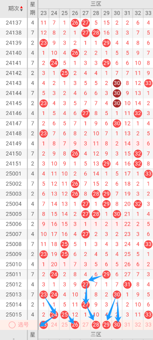 根据走势图可以看出当前区,006期开出没有开出号码球,007期开出来27一个号码球,008期开出了25.33二个号码球,009期开出了23.25二个号码球,010期没有开出号码球,011期开出了24.29二个号码球,012期开出了27.31二个号码球,013期开出了23.24.30三个号码球,014期开出了27一个号码球,015期开出了24.25.33三个号码球,按照如此规律判断本期当前区可能开2双或1双。我们看下当前区上期没有开出重叠号,那么本期当前区要定重叠号的情况下可关注33号码球。再看下当前区上期没有开出斜连号,当期选号得留意26斜连号。本区重点关注23.26.28.30