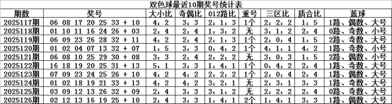 双色球第2025126期开出奖号为:02、12、13、16、19、25+10,其中红球号码奇偶比为3:3,大小比为2:4,012路比为1:4:1,和值为87,跨度为23,三区比为1:4:1,开出2个重复红球:12、13。蓝球开出偶数、大号、1路。