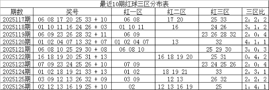 一区上期走温,出现1个奖号,近10期开出21个红球,走势与理论相当,本期看好转热,开出3个号码,参考号码03、08、09;二区上期表现较热,出现4个奖号,近10期共开出17个红球,走势相对较冷,本期预计继续温冷,在2个以内出号,注意号码16、22;三区上期走温,开出1个红球,近10期共开出22个红球,出号与理论个数持平,本期预计继续走温,出现1-2个红球,看好号码27;