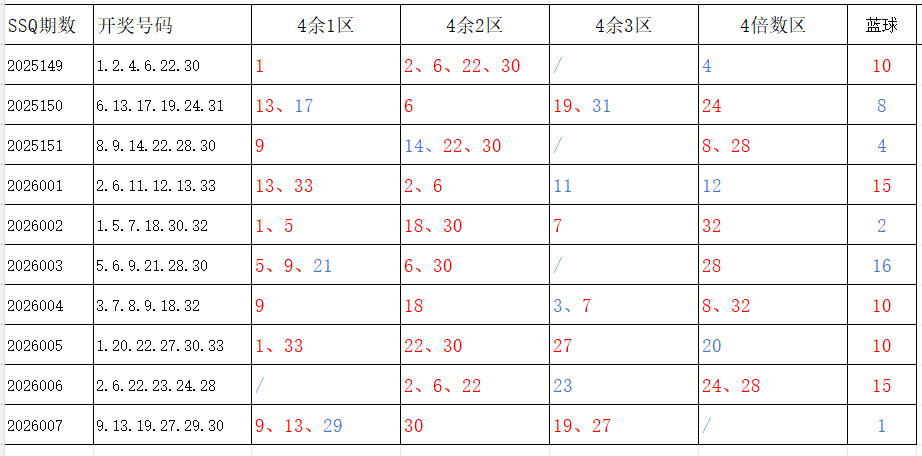 分享第一个数据分析:四分区统计数据。相对于传统的三分区,个人习惯使用四分区,就是把33个红球号码除以4,所得的余数分区如下: