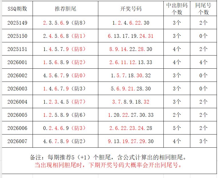 如图,每期推荐胆尾中出1-4个。上期推荐胆尾中出2尾4码!推荐胆尾是按照公式计算的顺序,不定位红球号码的顺序。本期推荐胆尾:0尾/2尾/7尾/4尾/6尾  。加推重点胆尾:***(会员专区可见)。推荐胆码号码:***(会员专区可见)。个人分析,仅供参考。
