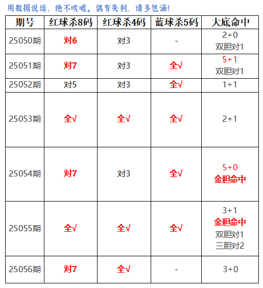上期红球杀8码对6,杀4码对3,蓝球杀5码全对,大底推荐失利,本期再接再厉!