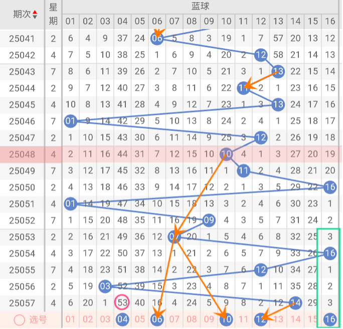 结合以上因素,本期蓝球推荐关注号码:04、06、10、12、16。